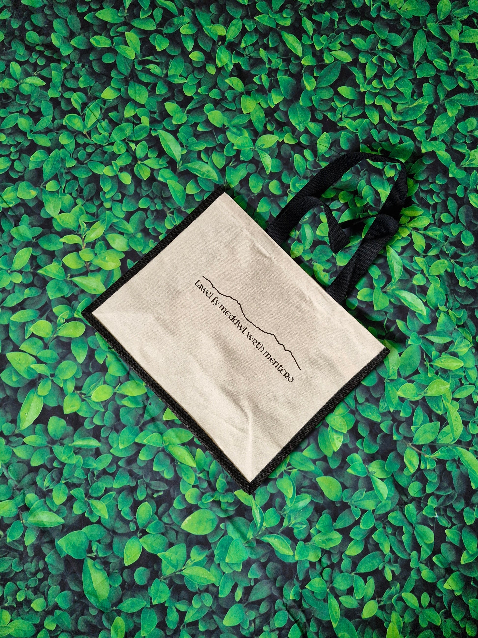 Jute bag with our 'Tawel Fy Meddwl' graphic.